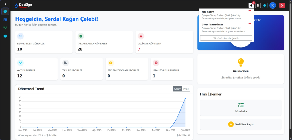 DocSign Kullanımı: Sözleşme yükleniyor, ilgili departmanlara otomatik görev ataması yapılıyor.